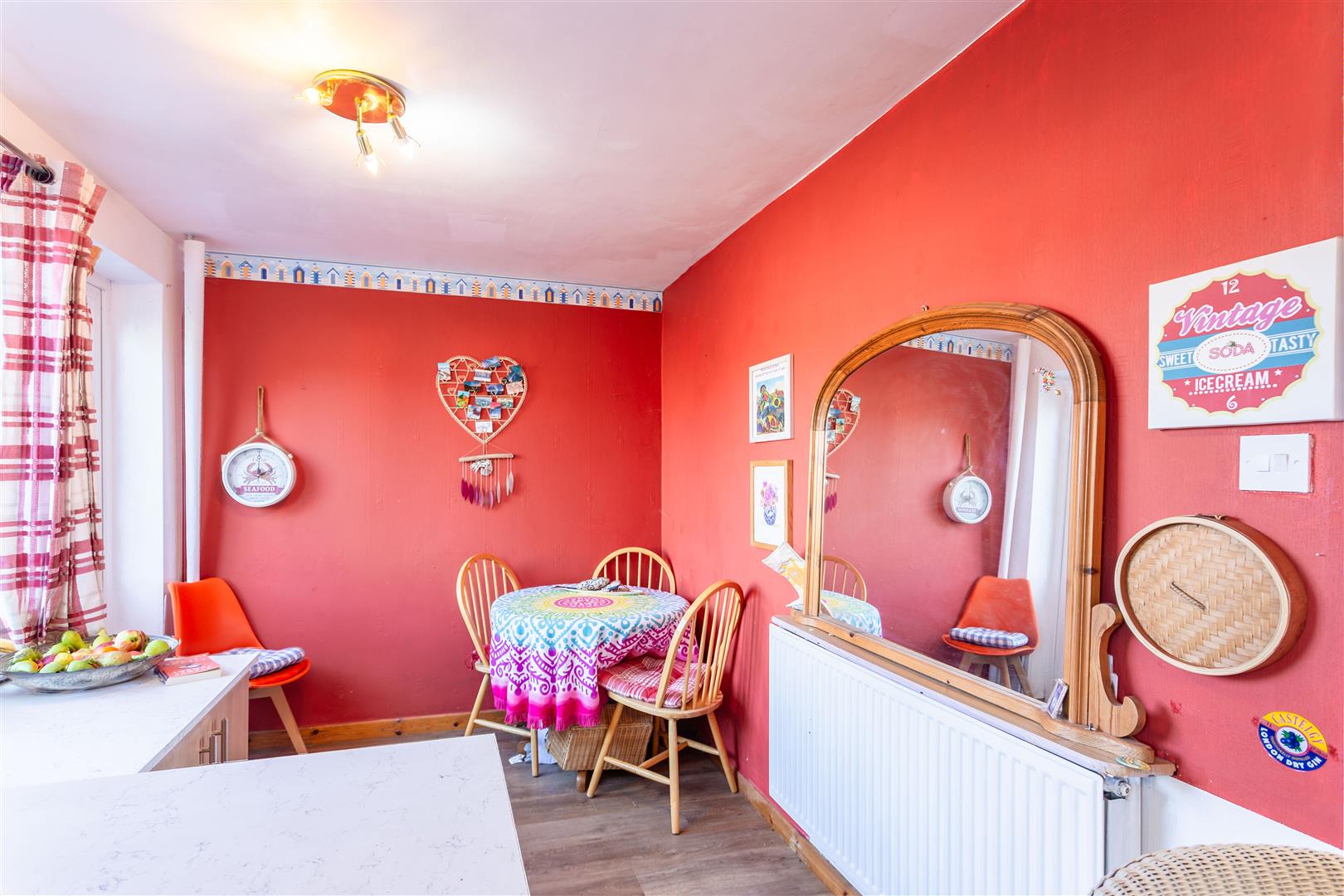 To the rear, the kitchen and dining area create a practical and sociable space. The kitchen is fitted with stylish wood-effect wall and base units, a built-in electric oven, and space for household appliances. A door from the dining area opens directly onto the rear garden.