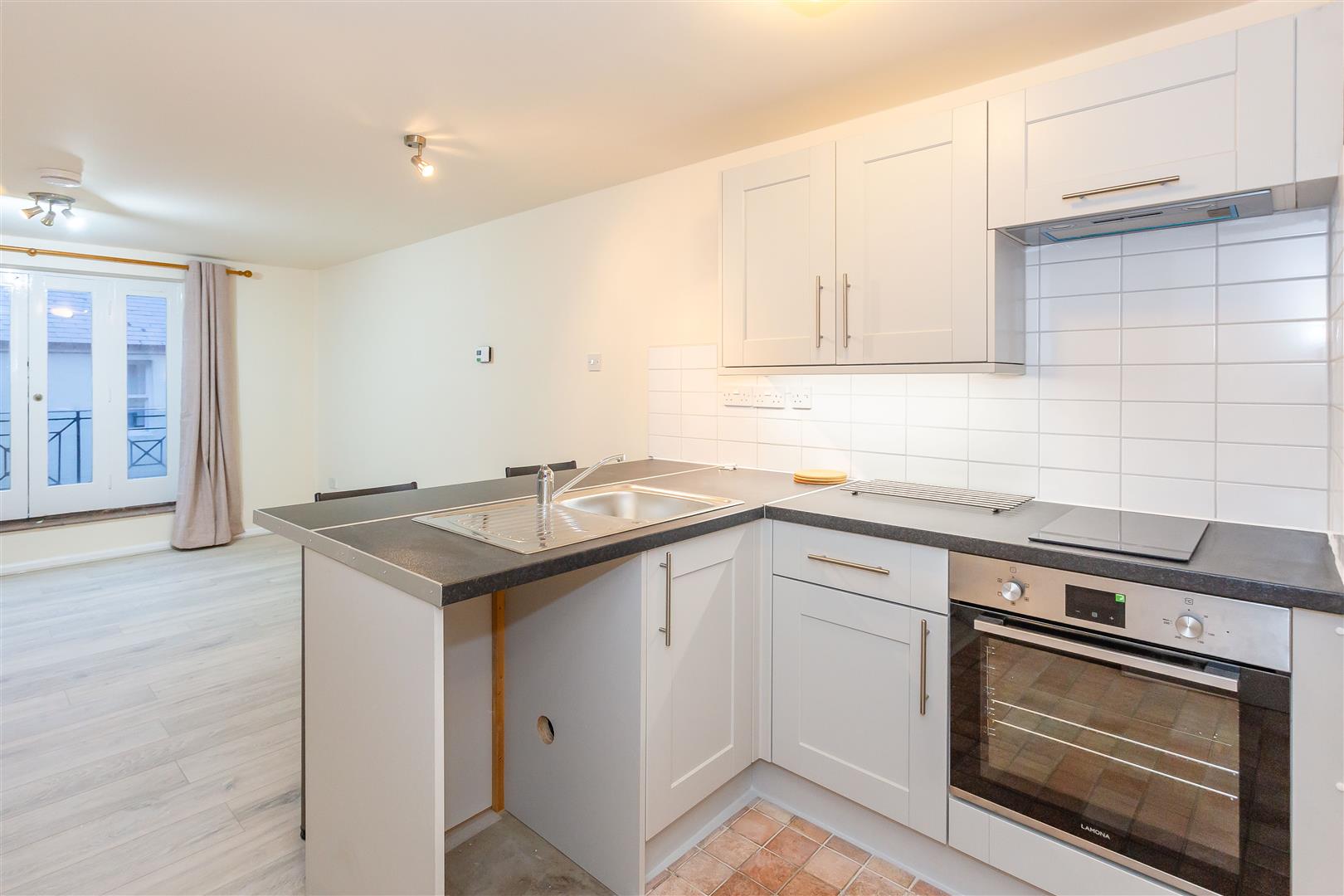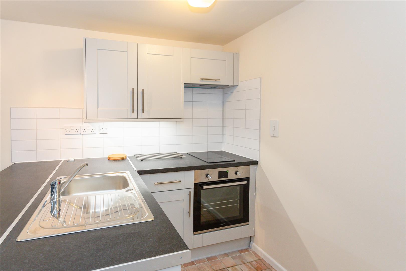 Kitchen Area – Modern grey kitchen with marble effect laminate worktop, ceramic white tiles, stainless steel sinking and drainer, built-in two heat zone ceramic hob, a built-in undercounter oven and extractor above, ceramic tiled flooring.