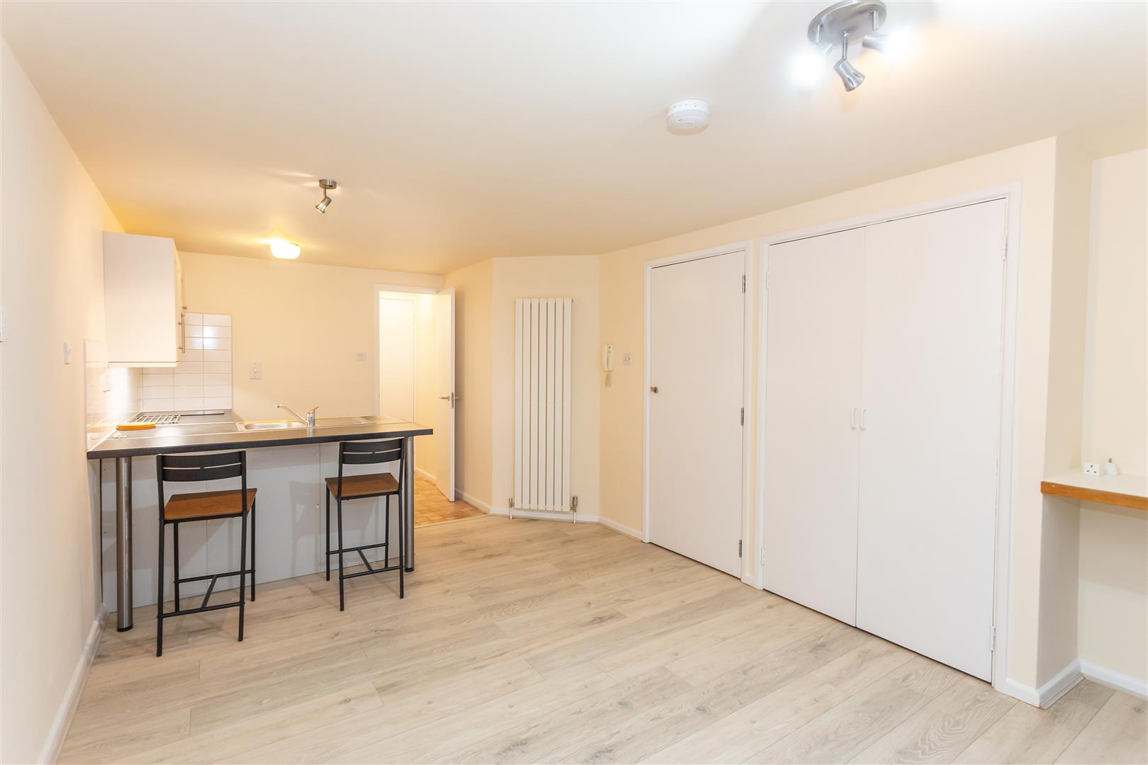Newly furbished with magnolia painted walls, grey wood effect laminate flooring, a built-in storage cupboard/ wardrobe, tall wall-mounted radiator. Double doors open to the Juliet balcony.
