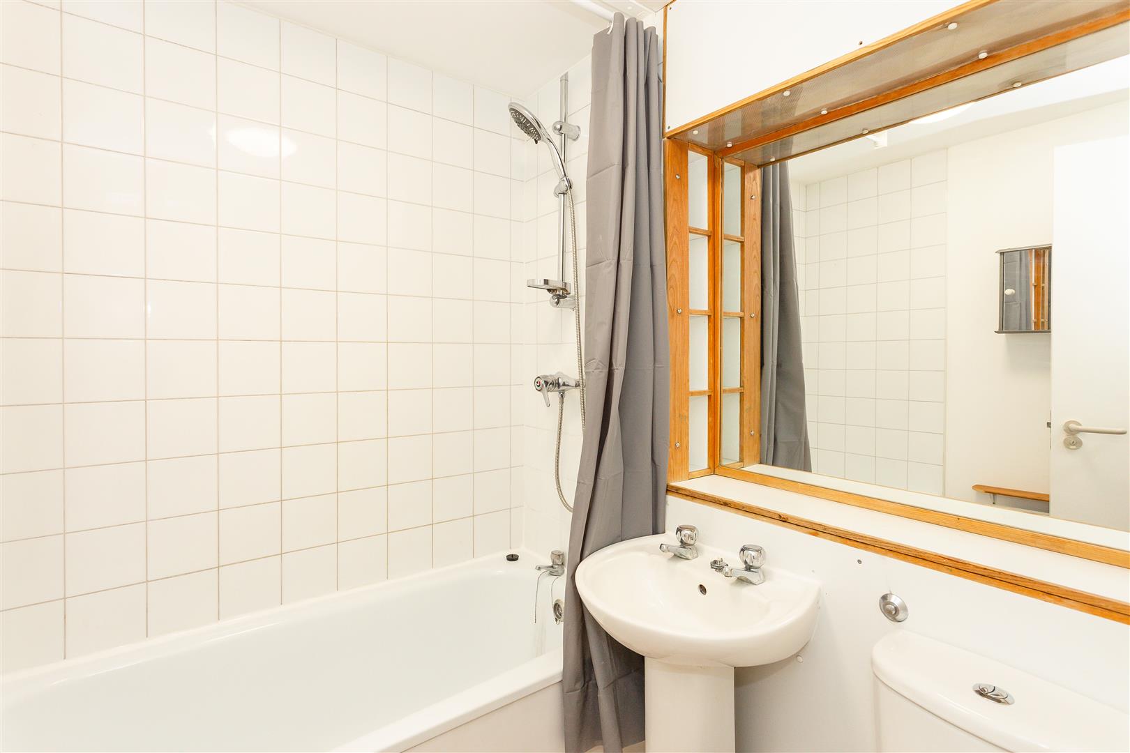 White suite comprising of a bath with wall mounted shower, pedestal hand wash basin and WC.