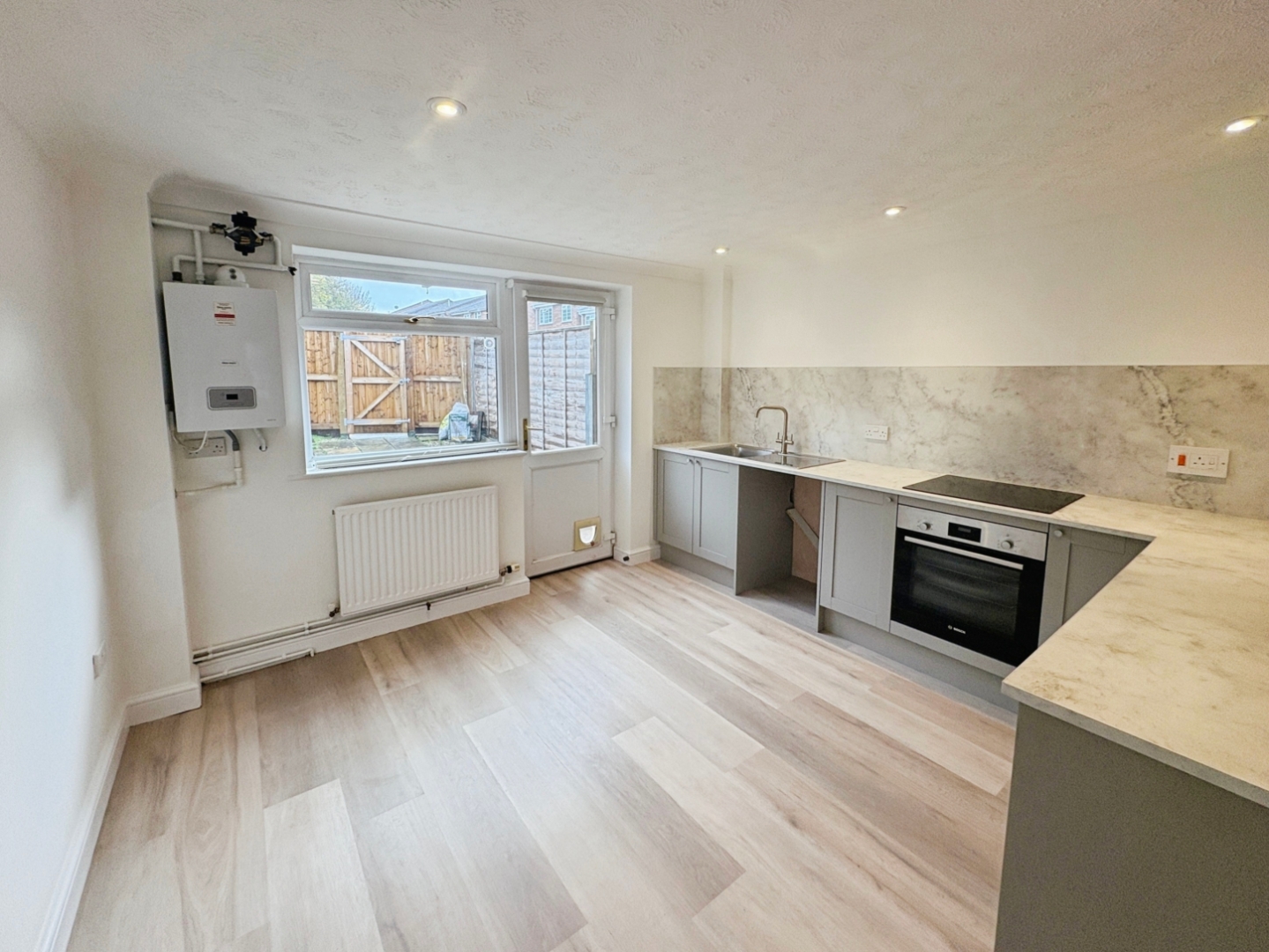 From the handy entrance porch, the property opens into a well-proportioned living room featuring front aspect window. This leads through to a kitchen/diner with a range of base and wall units in a neutral finish with a built in electric hob and oven, and access via the back door to the rear garden.