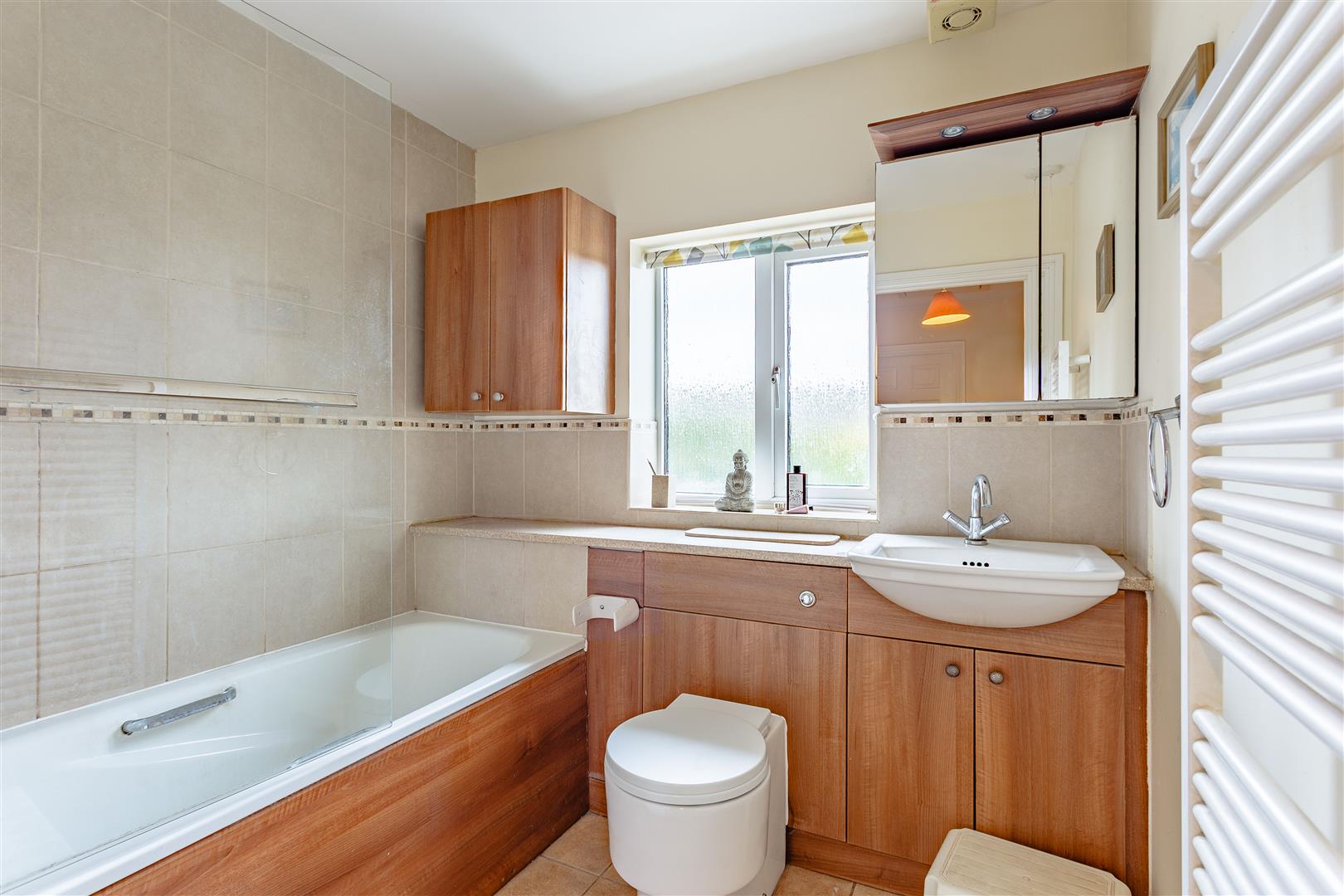 The family bathroom features a white suite with wooden effect finishing, including a bath with shower over, a WC and a sink set within handy storage units.