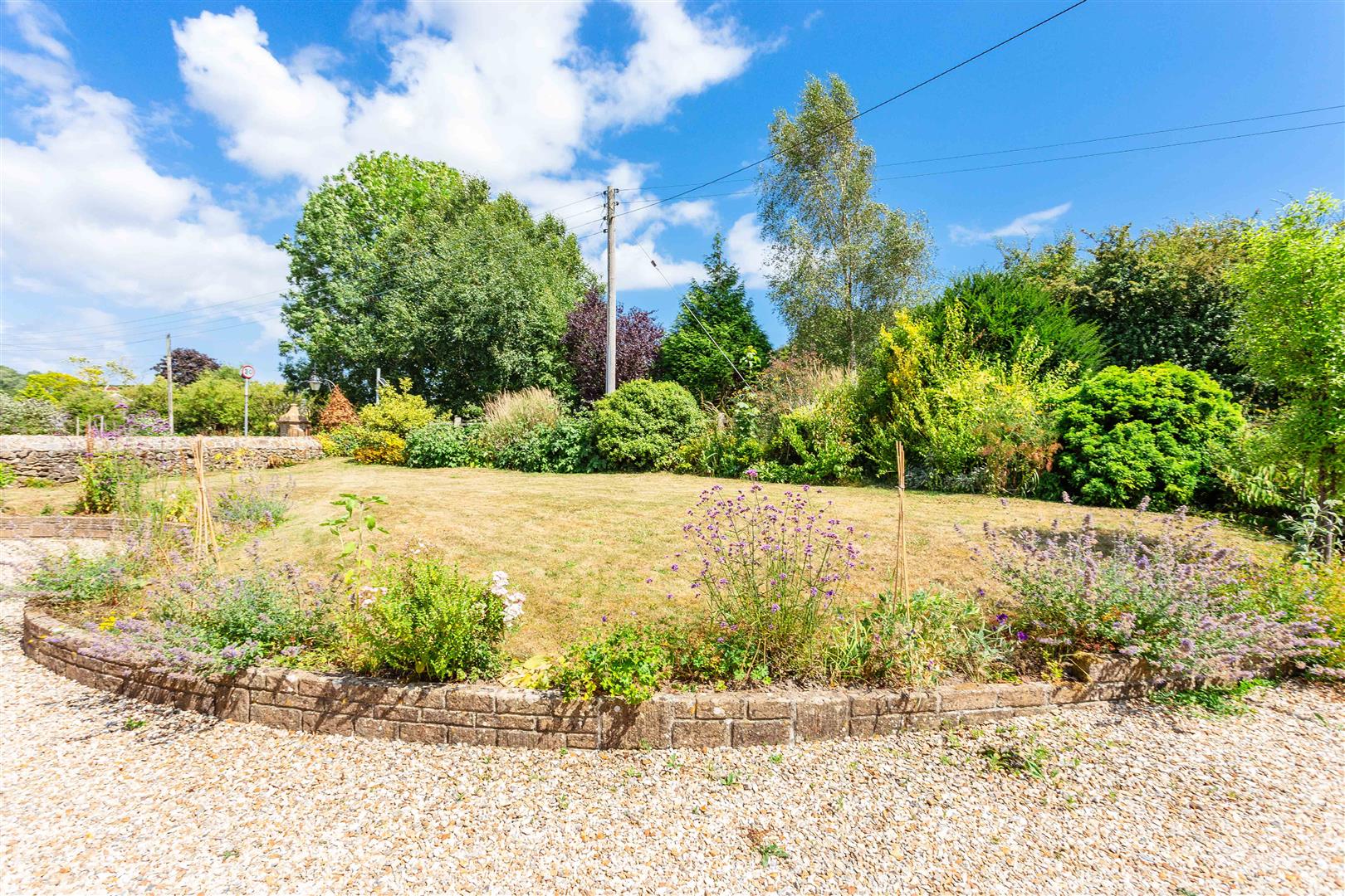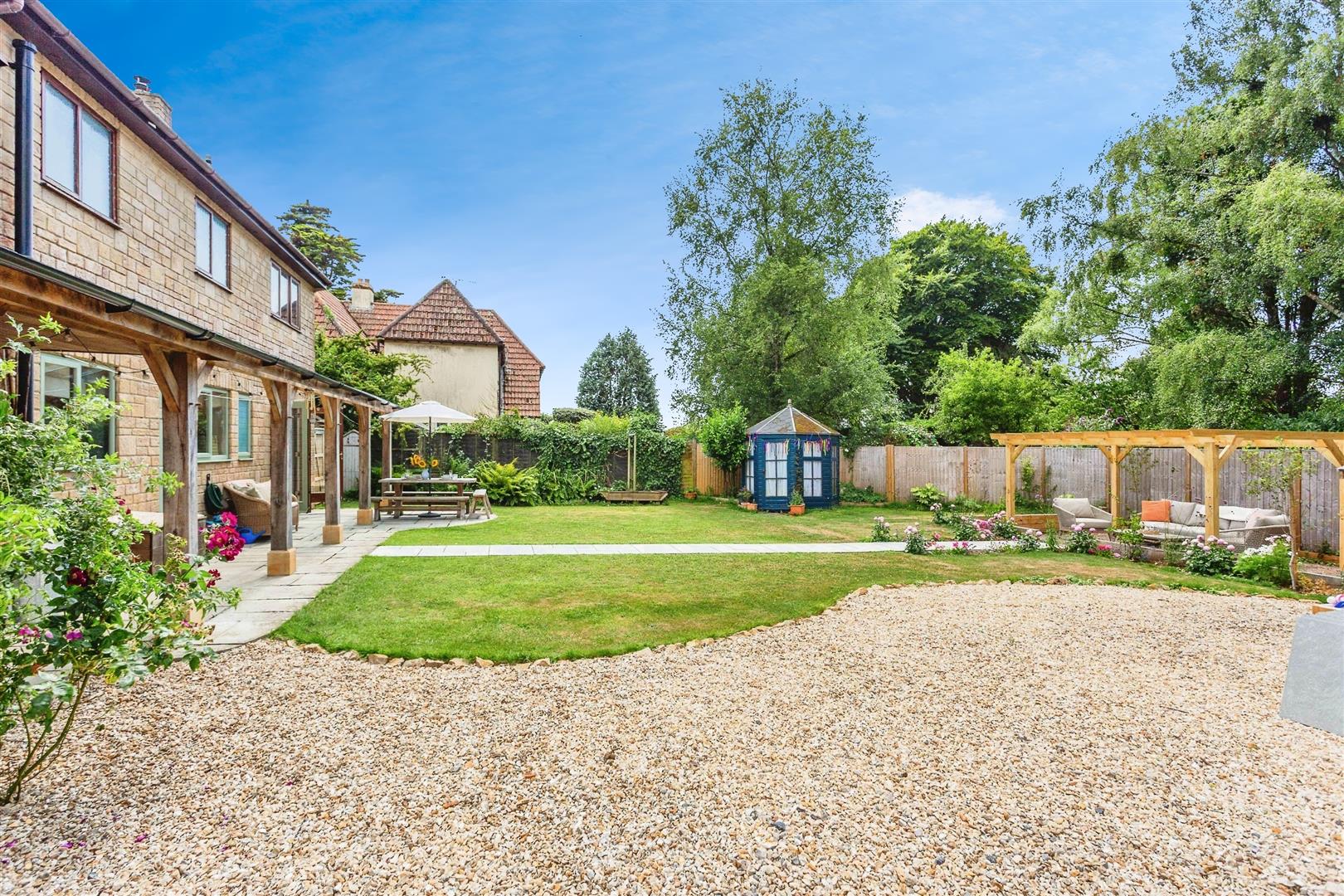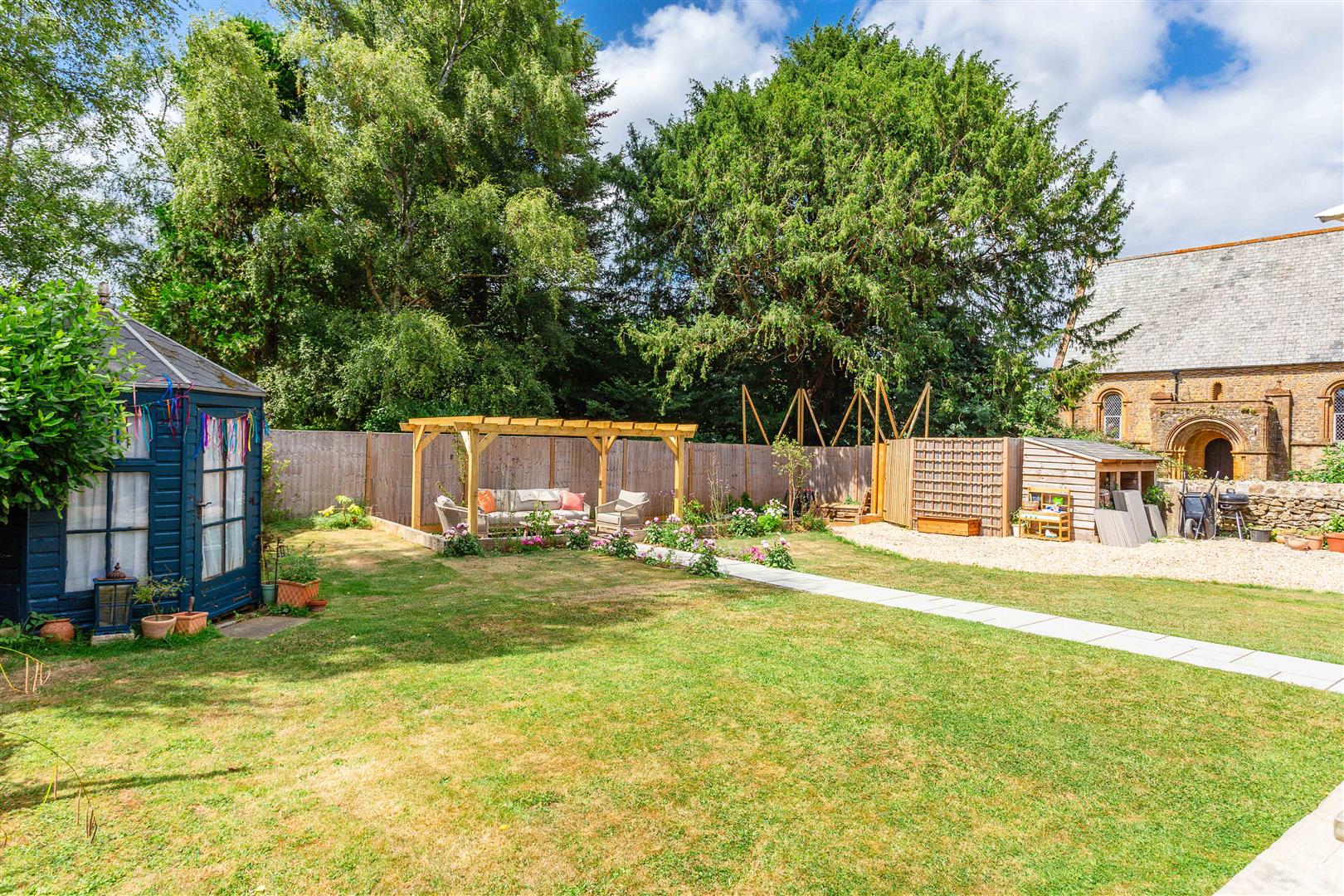 The garden is predominantly laid to lawn, complemented by a partial gravel area that adds texture and interest. It is beautifully landscaped with a covered patio seating area and a pathway leading to a charming pergola seating area at the bottom of the garden. A summerhouse and well-stocked flowerbeds further enhance the outdoor space. The garden overlooks mature trees that soften the view and enclose the grounds, with a delightful sight of the church visible to the right-hand side. To the front, the garden features a gravel driveway and a raised lawn bordered by flowerbeds and shrubs. Parking is plentiful, offering ample space for vehicles.
