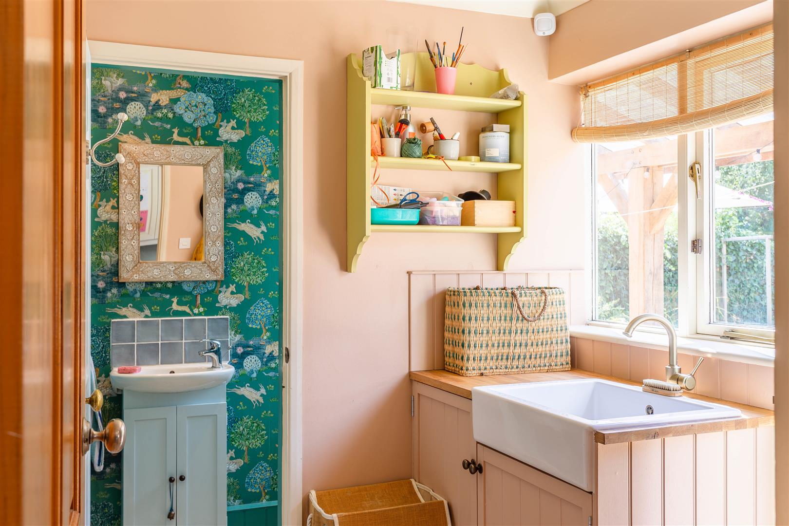 A door from the kitchen leads to a practical utility room, equipped with a second sink and space for a washing machine and fridge freezer. From here, there is also access to a downstairs cloakroom and the rear garden. With the exception of the living room, the entire ground floor is finished with attractive porcelain tiles.