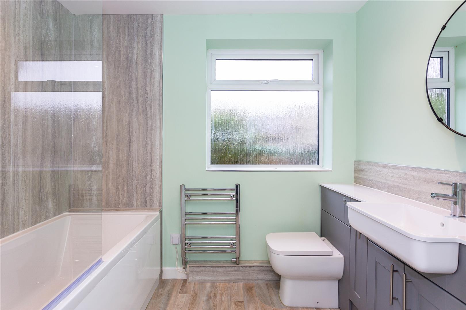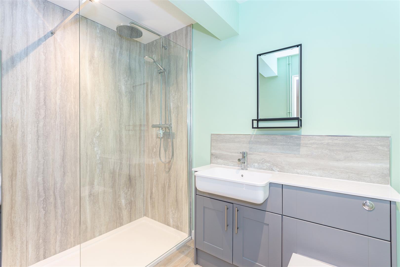 Bath, wall mounted shower with rainfall showerhead, glass shower screen. Vanity unit incorporating WC and handwash basin. Wall mounted mirror. 2.96m x 2.46m