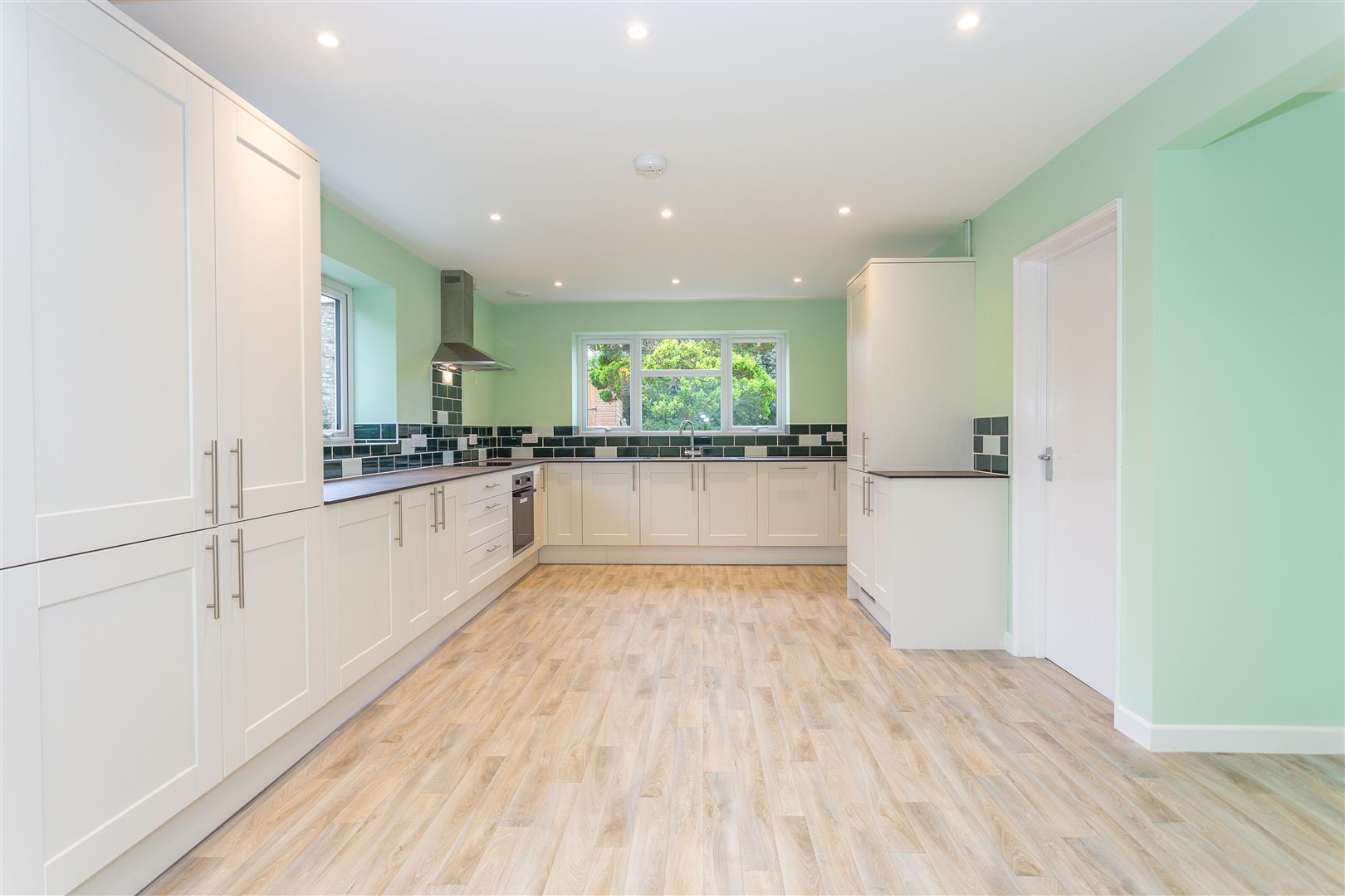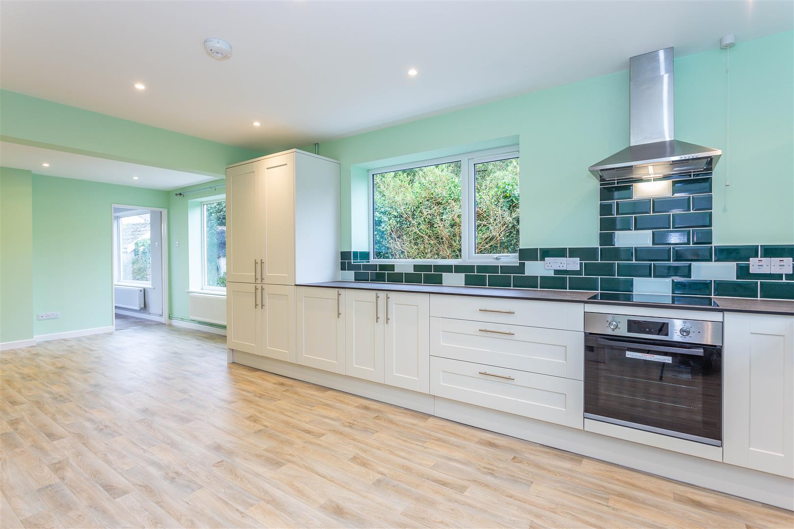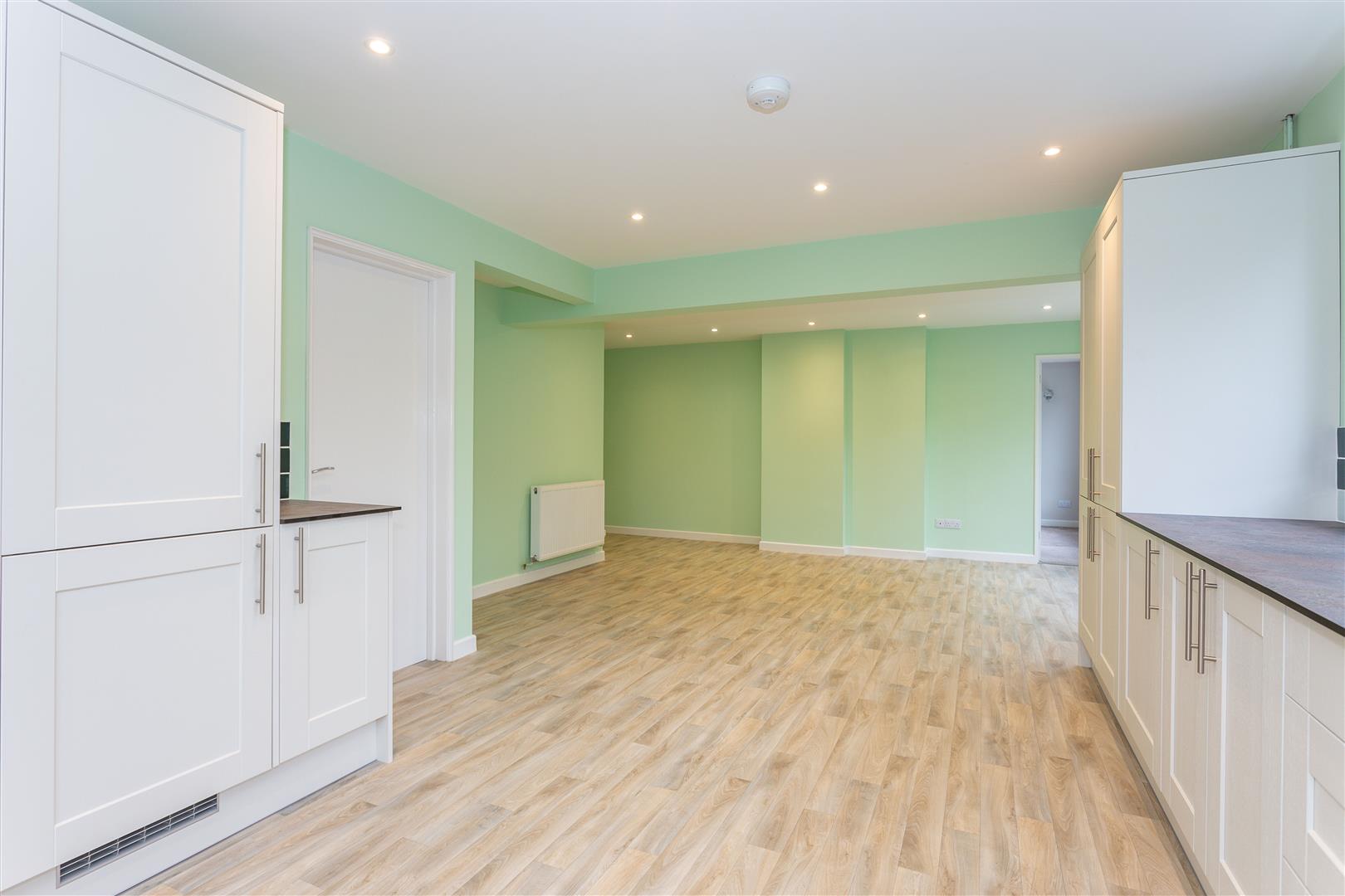 Dual aspect, newly fitted kitchen with built-in Oven, hob, extractor hood, dishwasher and fridge freezer. Door to rear garden. 7.85m x 4.64m (Approx)