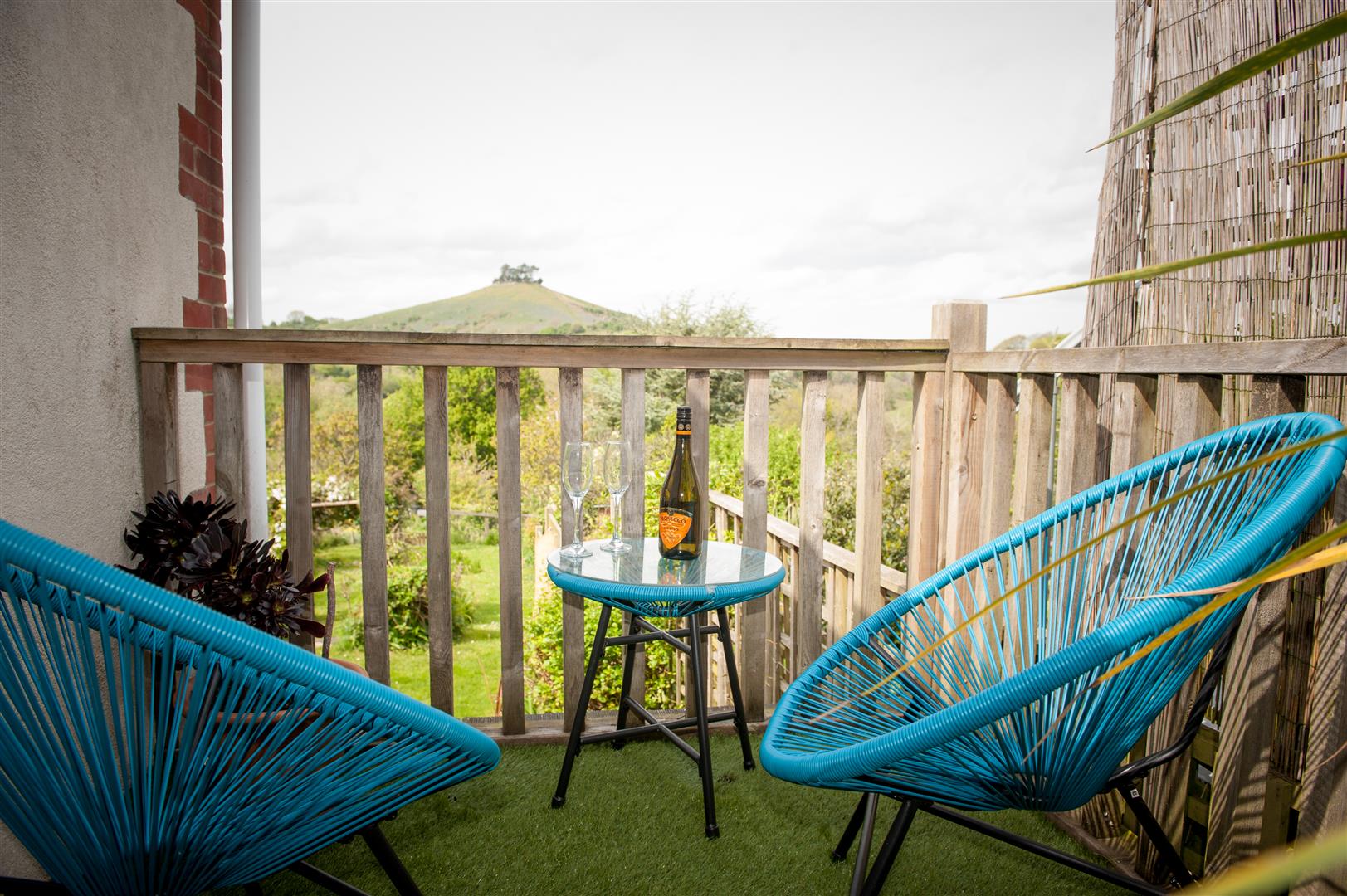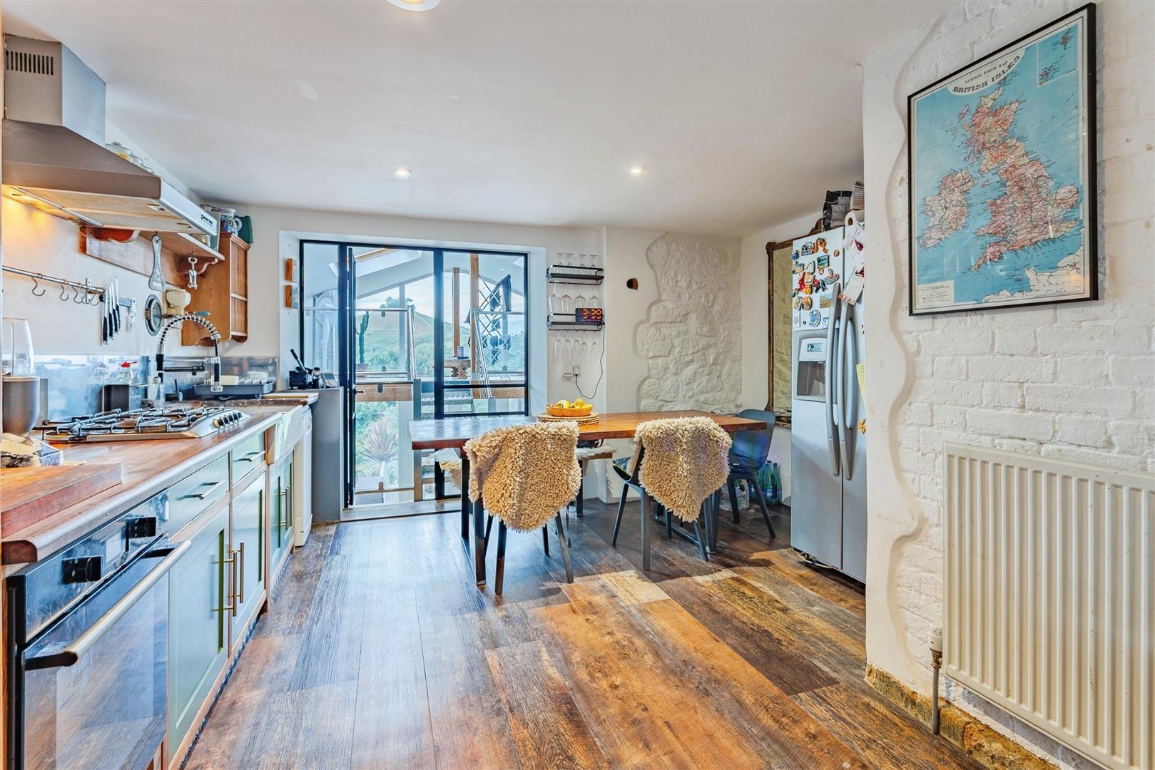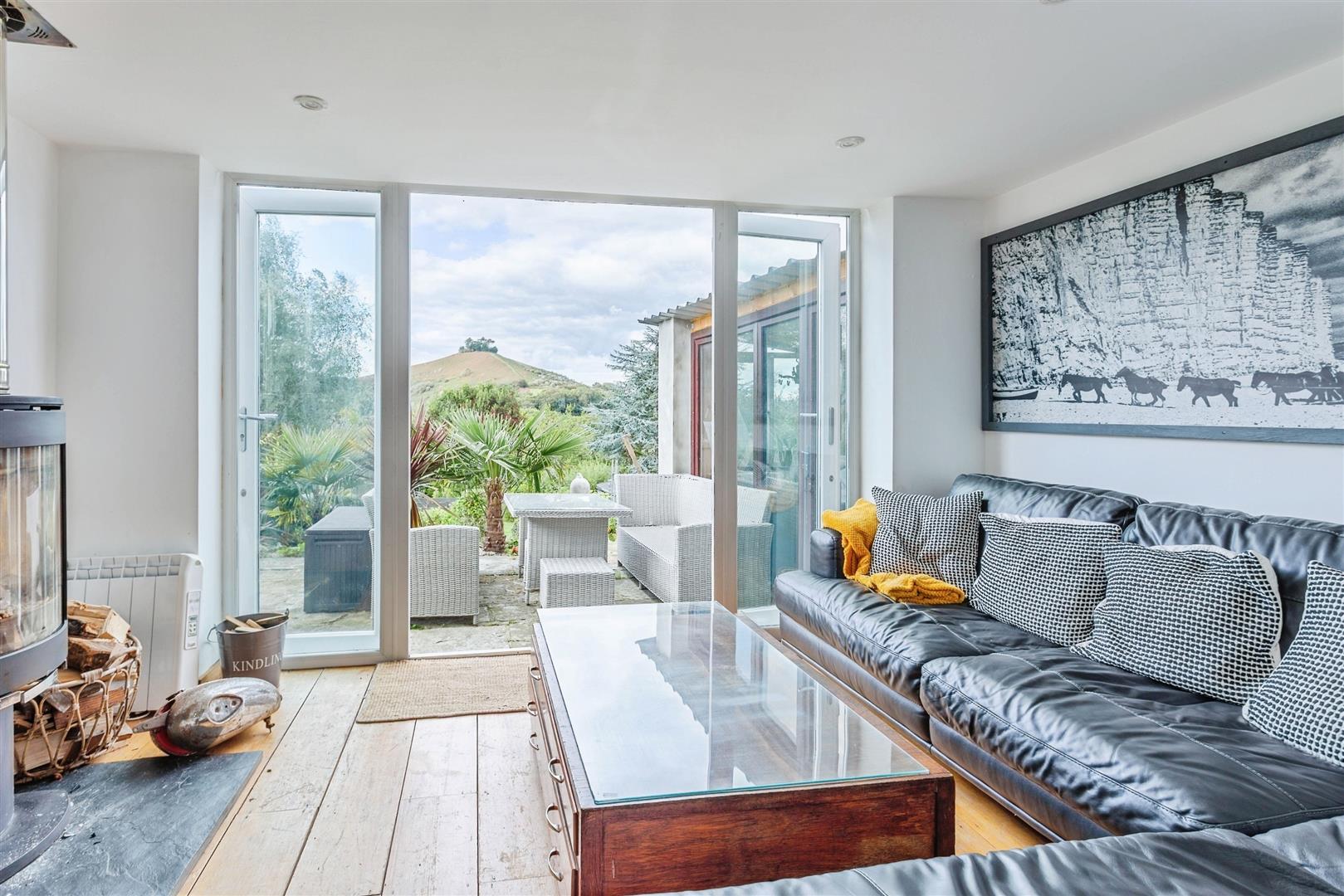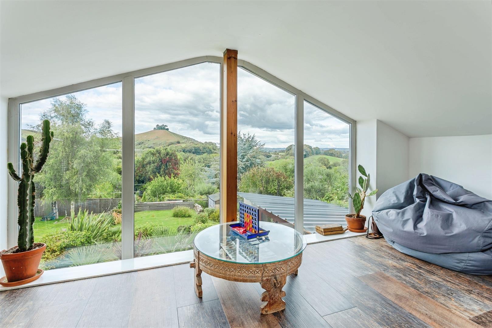Striking industrial-style glazed doors open into a spectacular rear addition — one of the property’s standout highlights. This impressive space includes a mezzanine level (Restricted head height) with a fully glazed window, flooding the interior with natural light while framing breathtaking views towards the iconic Colmers Hill and beyond.