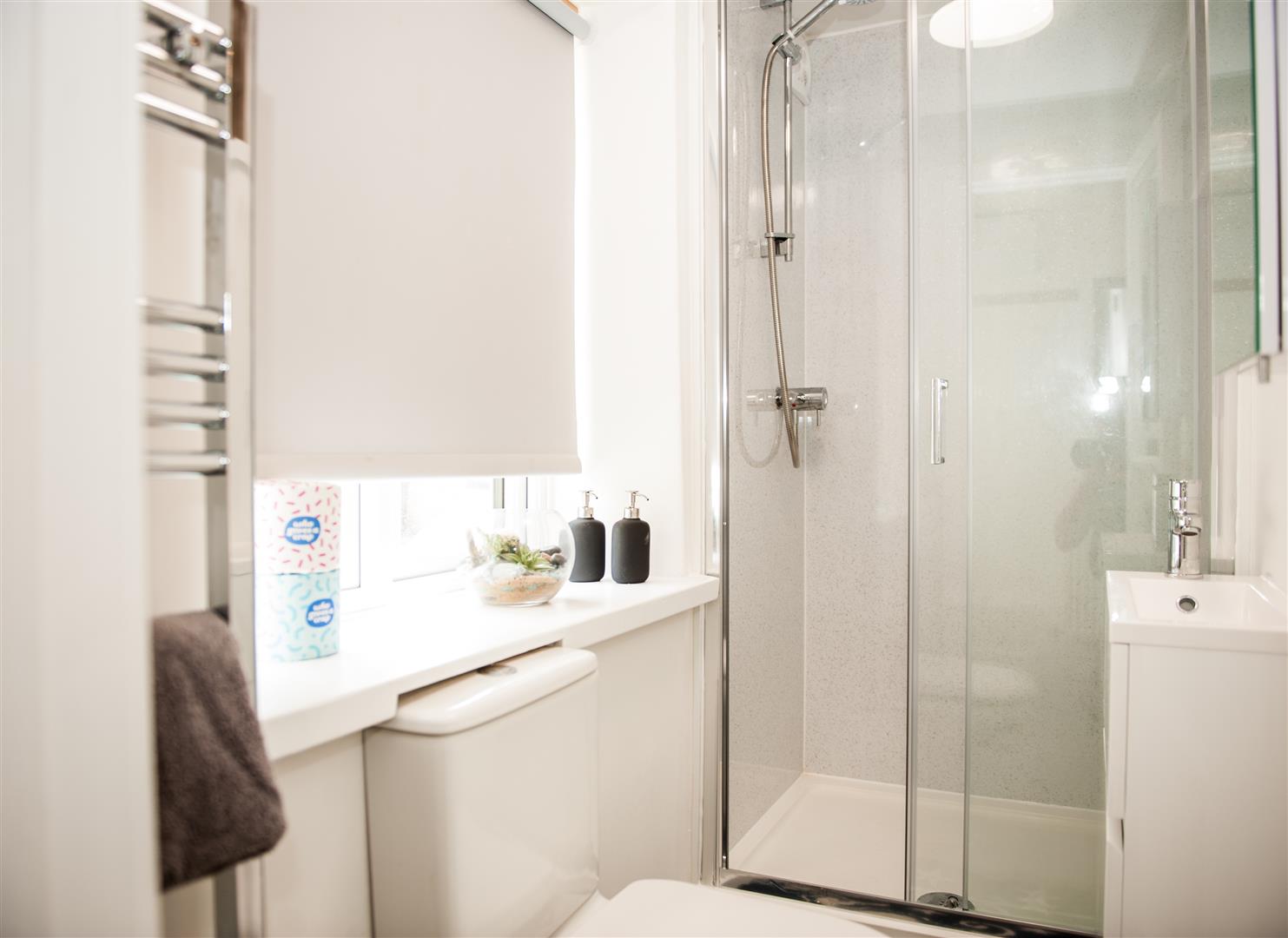 Upstairs, the property offers three well-proportioned bedrooms. The main bedroom is a large double, providing plenty of space for freestanding furniture and a rear-aspect window. The front bedroom is also a double, while the third bedroom is a comfortable single. The family bathroom is designed in a heritage style and comprises a shower enclosure, WC, and hand wash basin. At the centre of the room sits an impressive roll-top bath, perfectly positioned to relax and enjoy the remarkable views.