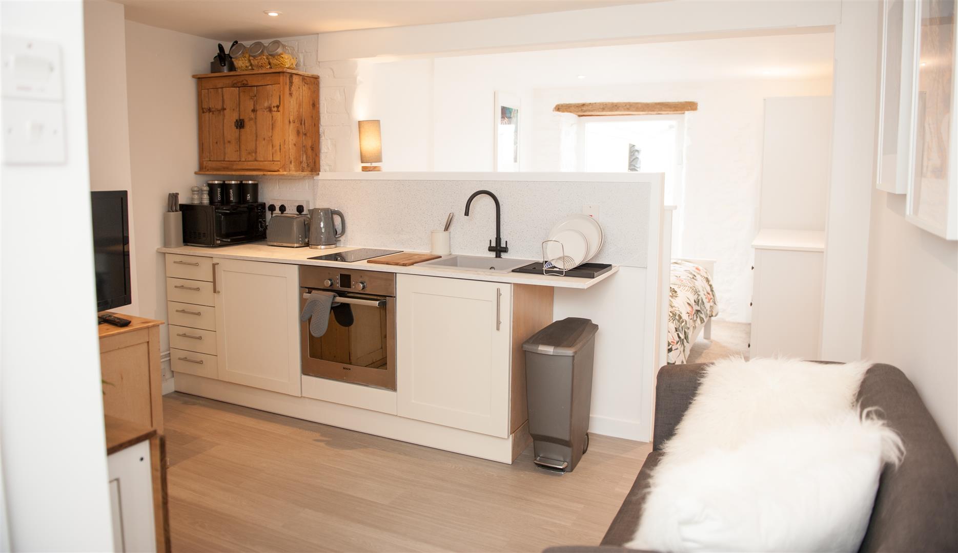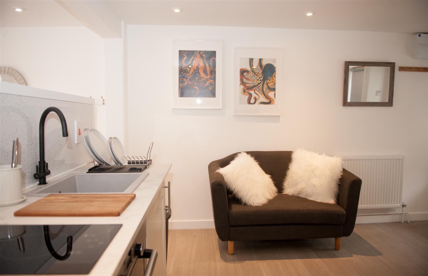 The self-contained annexe benefits from its own private entrance and comprises an open-plan living/bedroom area, kitchenette, and shower room. It also has a rear door opening onto its own small decking area, offering a private outdoor space for relaxation or entertaining.