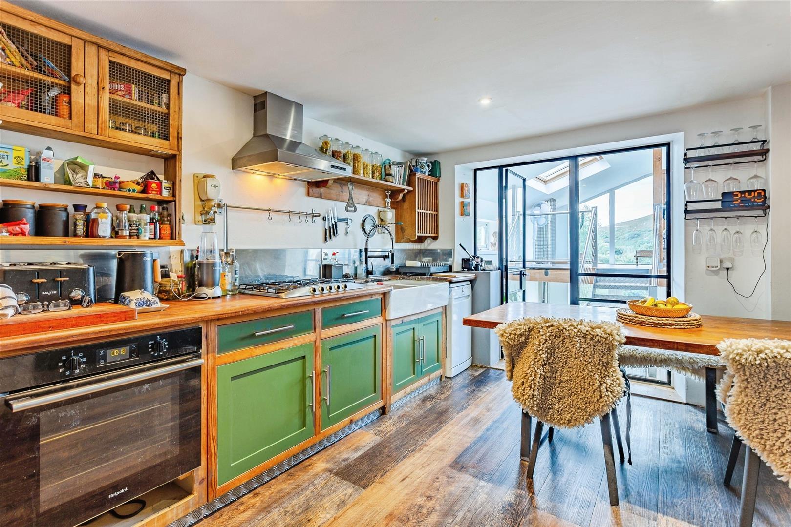 The ground floor opens directly into a stunning open-plan kitchen/dining room, styled with farmhouse base units and industrial-inspired features. The kitchen is beautifully finished with a real wood worktop and fitted with an undercounter oven, gas hob, overhead extractor hood, and a classic double Belfast sink, with space for an undercounter appliance.
