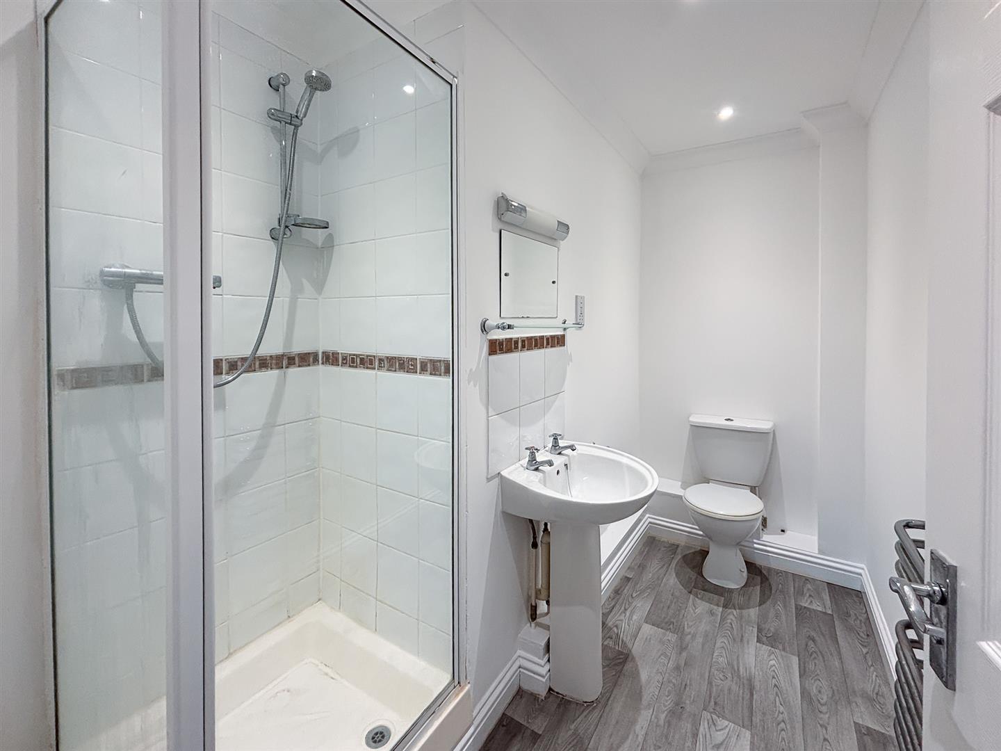 There are two bedrooms — a double bedroom with en suite shower room comprising shower, handwash basin and WC, and a single bedroom — along with a separate family bathroom fitted with a bath, basin, and WC.