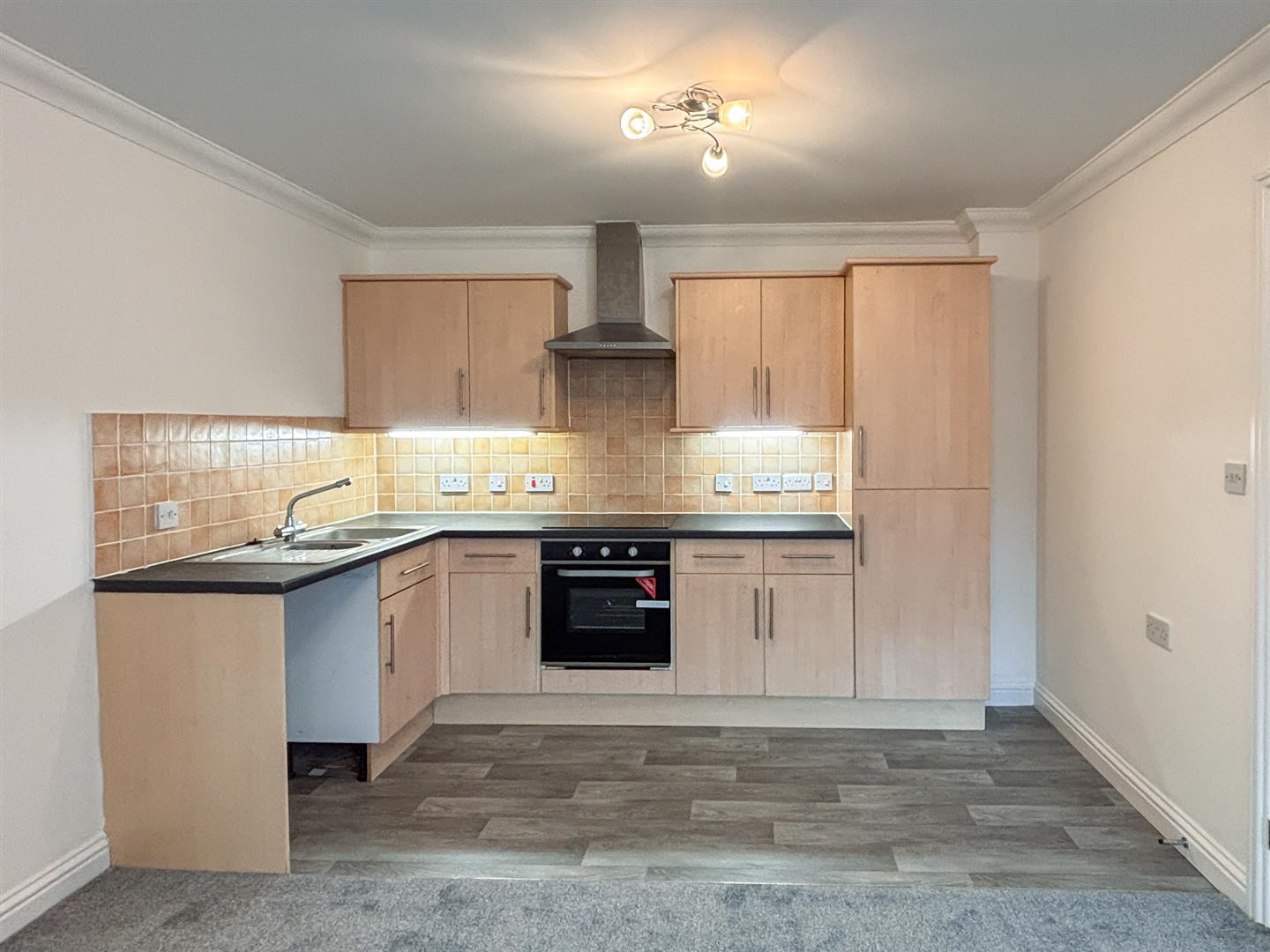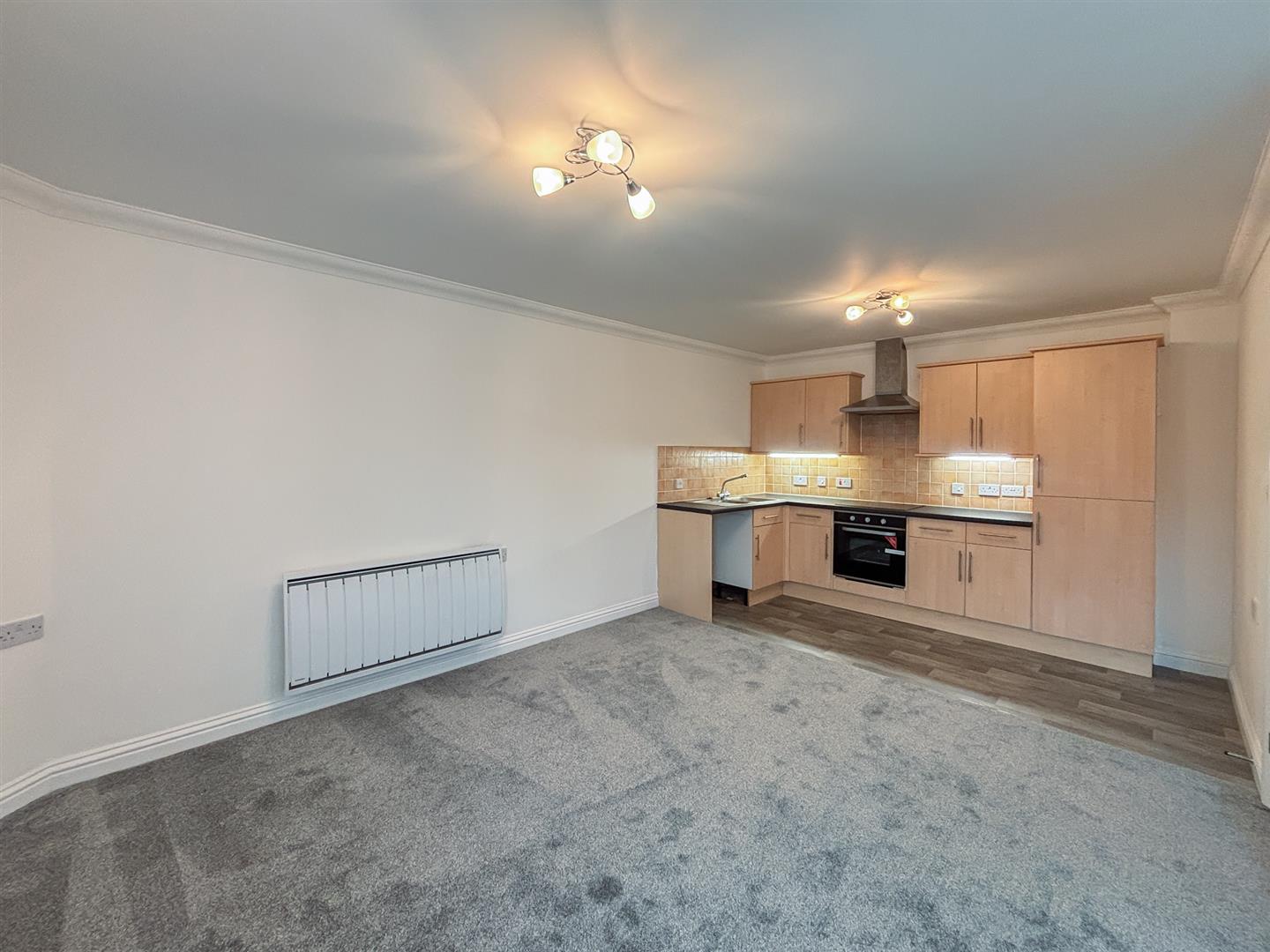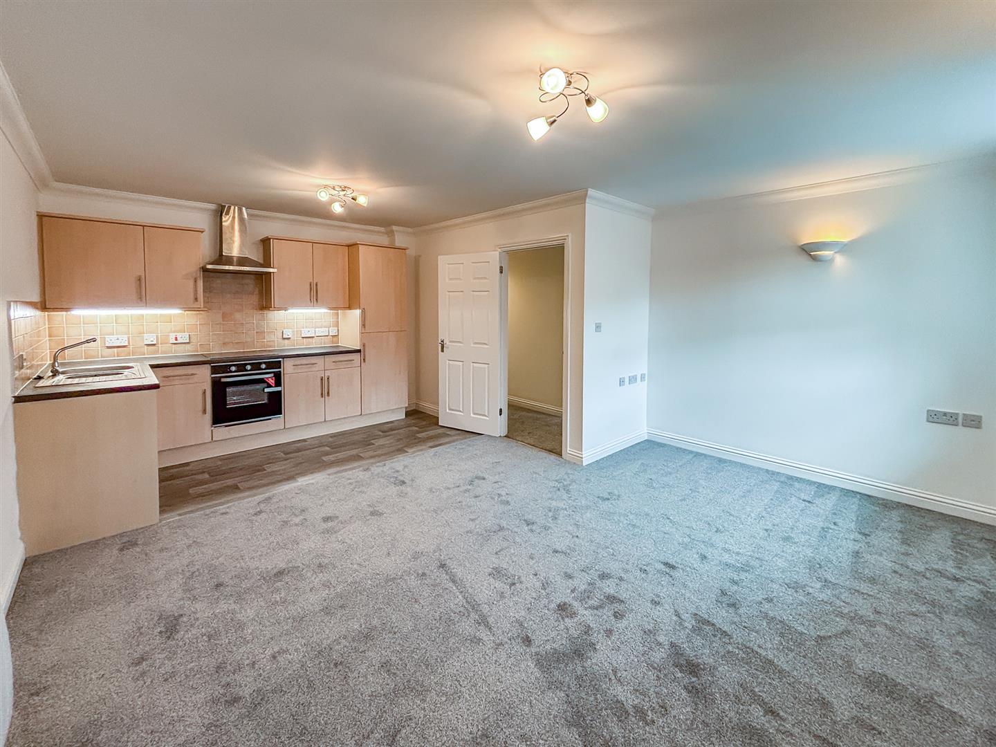 The property features a bright open-plan living area with a modern fitted kitchen, including an integrated oven, ceramic hob with extractor, stainless steel sink with drainer, and space for freestanding appliances. The living room also benefits from a walk-in airing and storage cupboard housing the hot water tank.