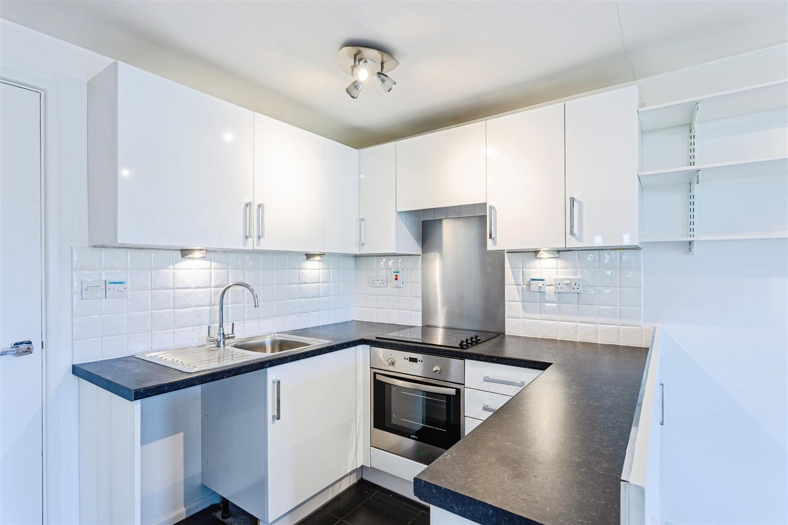 The kitchen is fitted with a selection of base and wall-mounted units, a worktop electric hob, integrated electric oven, and space for a freestanding fridge.